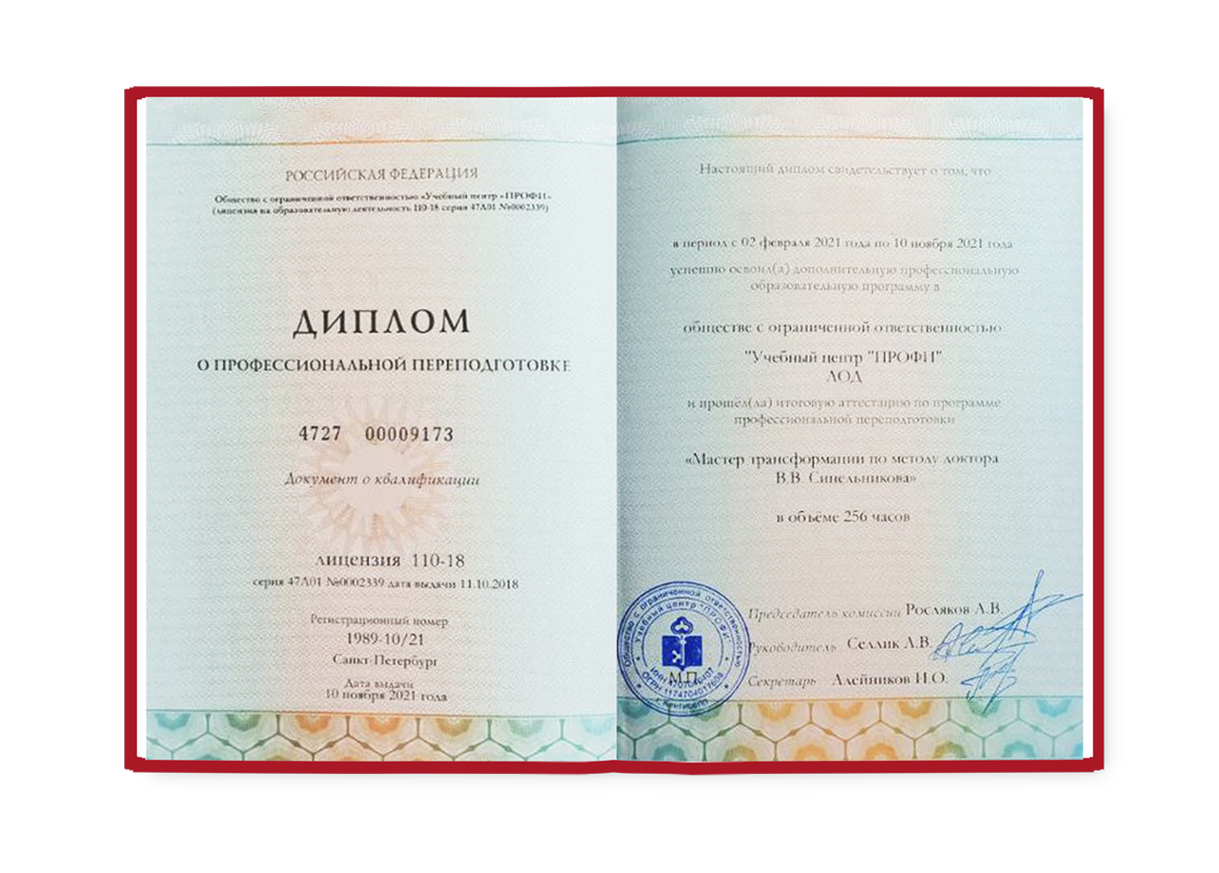 Буквально позавчера закончился курс «Мастер Трансформации». 9 месяцев и 9 дней — замечательное время, я ни на секунду не пожалела, что училась у таких замечательных учителей как наши. Благодарю от души каждого! Это было время личной трансформации, сложился пазл из всех тех знаний, которые были, в глубину понимания, осознания того, как устроен человек, его мировоззрение, Вселенная. Поэтому я очень благодарна за эти знания нашим учителям. Этот курс я проходила для того, чтобы поменять свою профессиональную деятельность. И я это благополучно сделала. Я начала практиковать примерно после трёх месяцев теории. На сегодняшний день, после того, как я закончила обучение, я провела около 200 консультаций, после которых получила замечательные отзывы от клиентов. Они поменяли свою жизнь в самую лучшую сторону в области отношений, здоровья, финансов, карьеры и вообще взаимодействия с окружающим миром. Теперь я очень счастлива быть этим проводником для людей, таким светлым лучиком, продолжением Валерия Владимировича Синельникова, его последователем. Это очень радостно, очень ценно. Все те знания, которые были даны на курсе, используются повседневно, ежесекундно, ежеминутно в своей семье, с окружающим миром, радостно жить такой жизнью, которая может быть примером для других людей. И всё это благодаря этому замечательному курсу! Очень рада быть сопричастной Школе Валерия Владимировича Синельникова и нести свет людям благодаря этим знаниям. Благодарю ещё раз!
